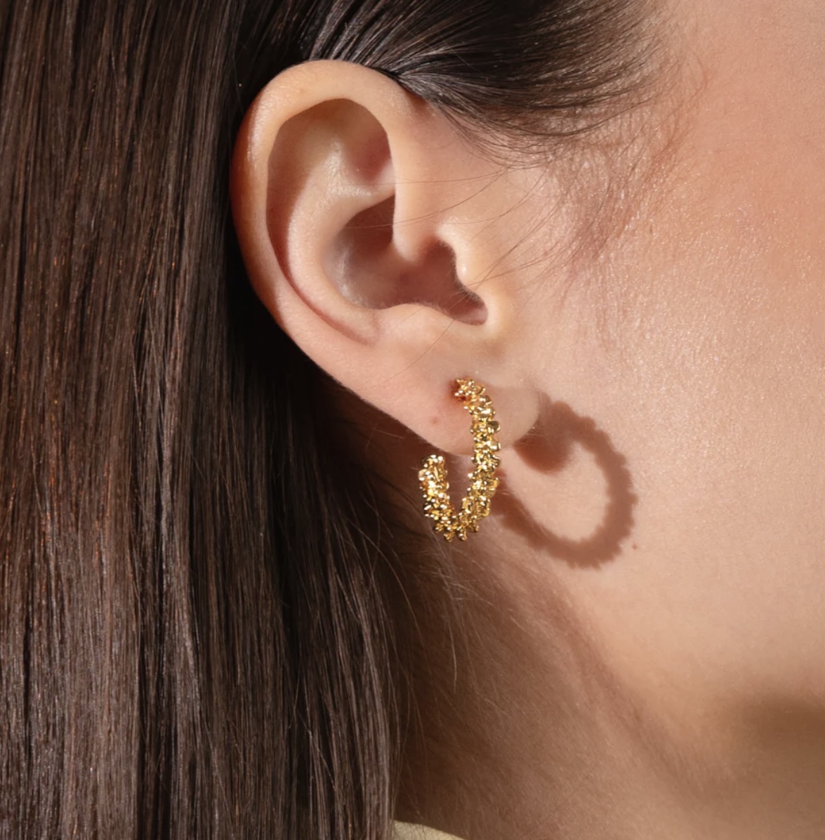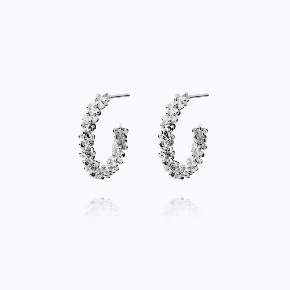 Gemma Loops fra Caroline Svedbom er øreringer formet som klassiske hoops, men med en unik, teksturert overflate som gir dem ekstra karakter. Den avrundede formen reflekterer lyset i alle vinkler, og resultatet er et par lette, men iøynefallende øredobber som tilfører et tydelig statement uten anstrengelse.