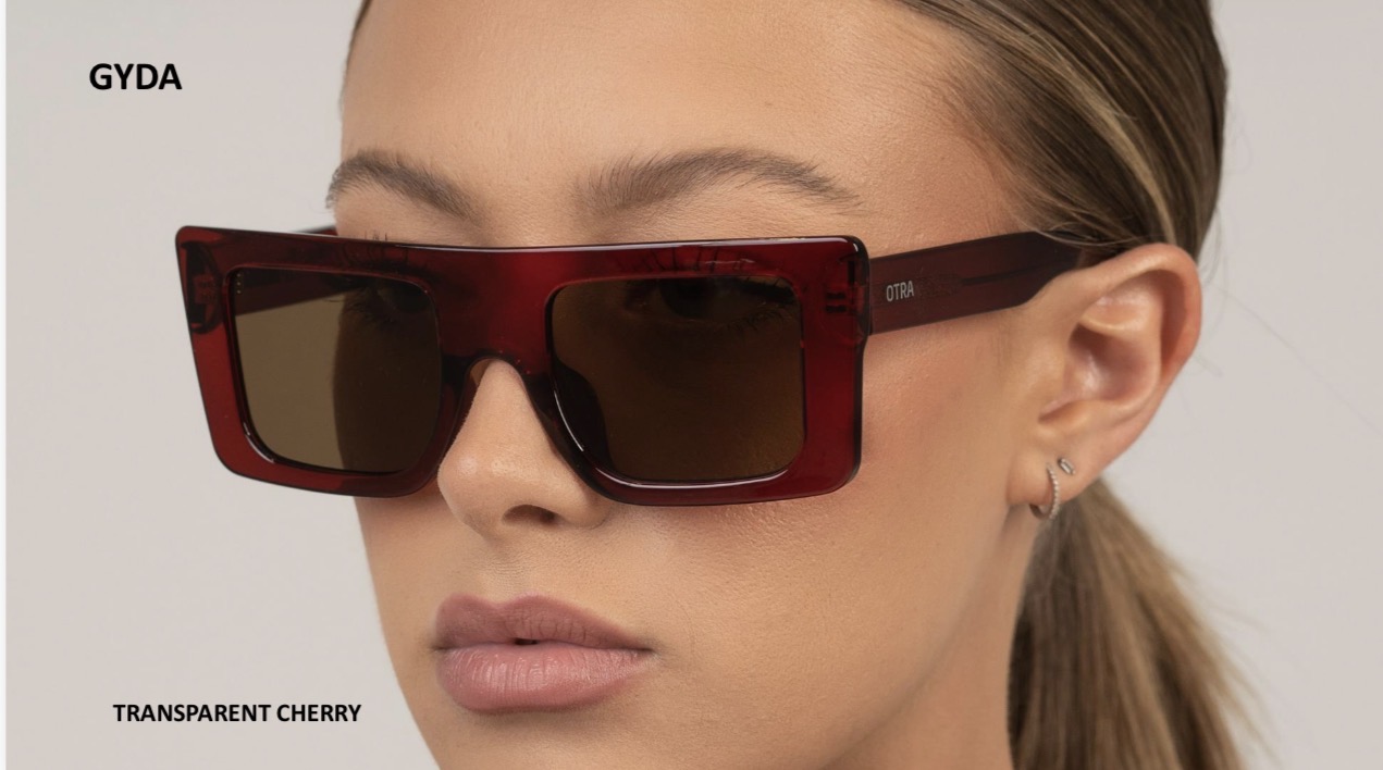 Gyda fra Otra Eyewear er stilige solbriller med oversized, rektangulær fasong. Ramme i en burgunder farge med linser i brunt. 100% UV-beskyttelse. Mykt etui følger med.